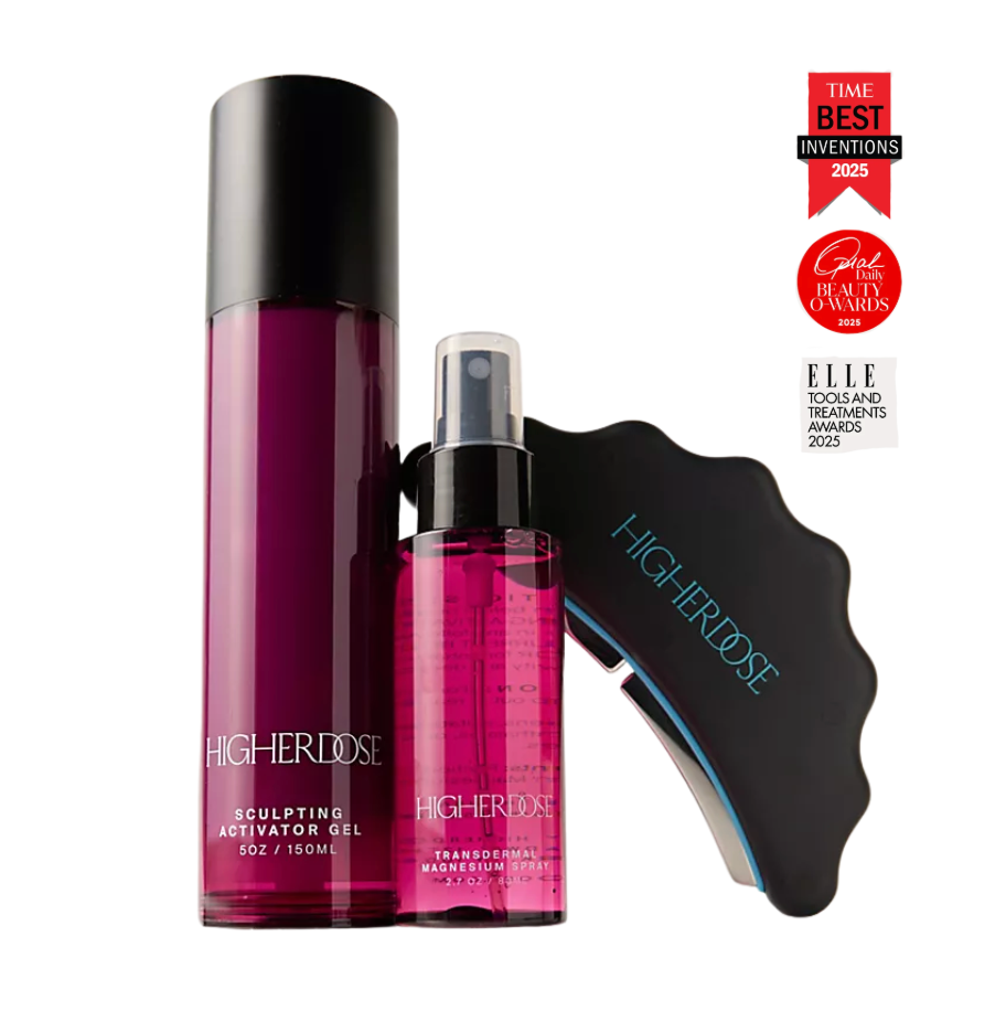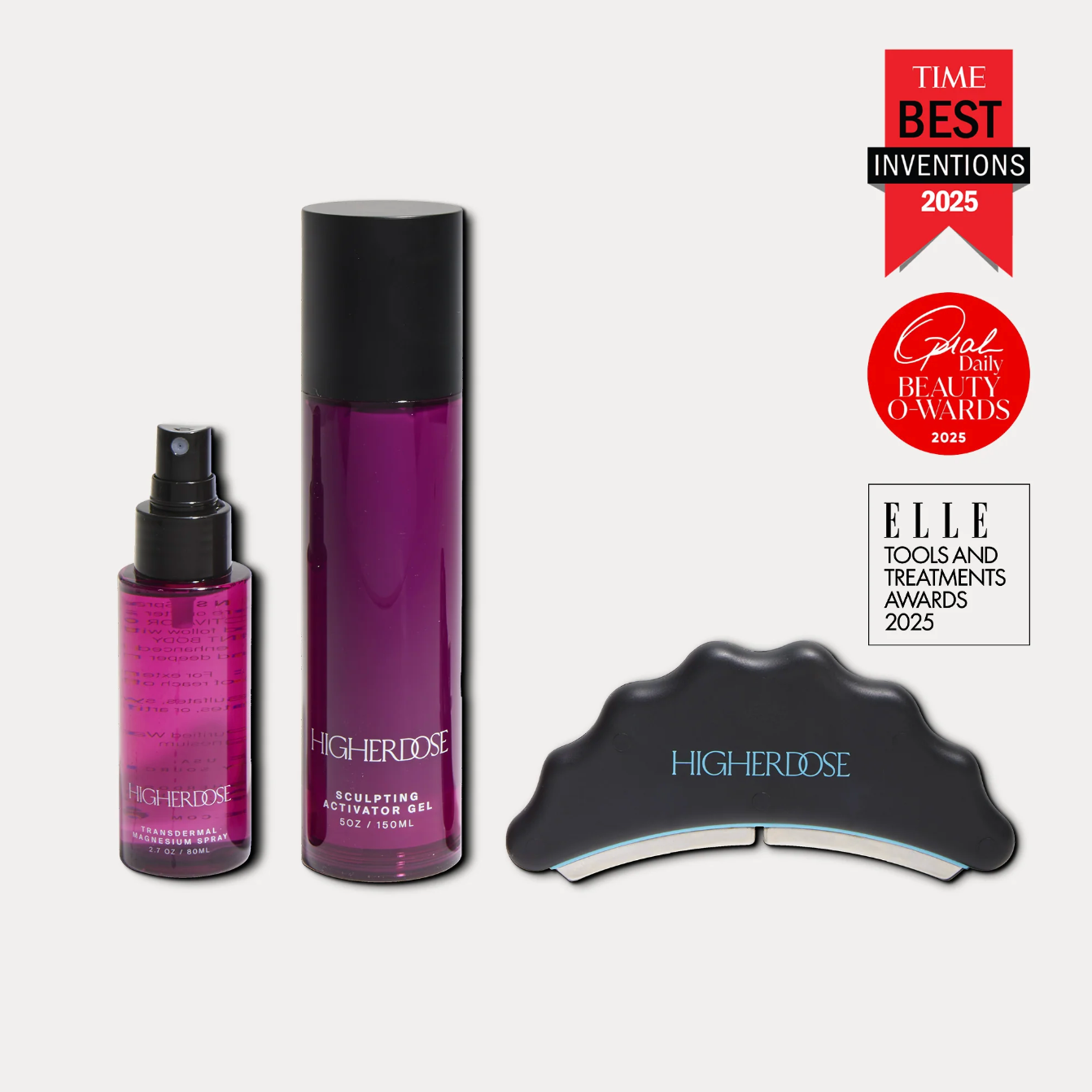 El set incluye un escultor corporal de microcorriente, un spray transdérmico de magnesio que prepara la piel y apoya la relajación muscular, y un gel activador conductor que optimiza la conducción de la microcorriente para mejores resultados.