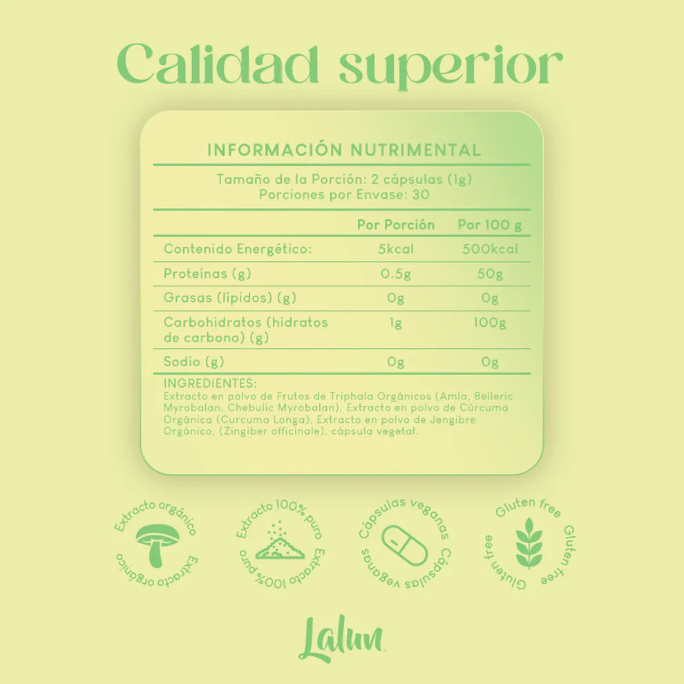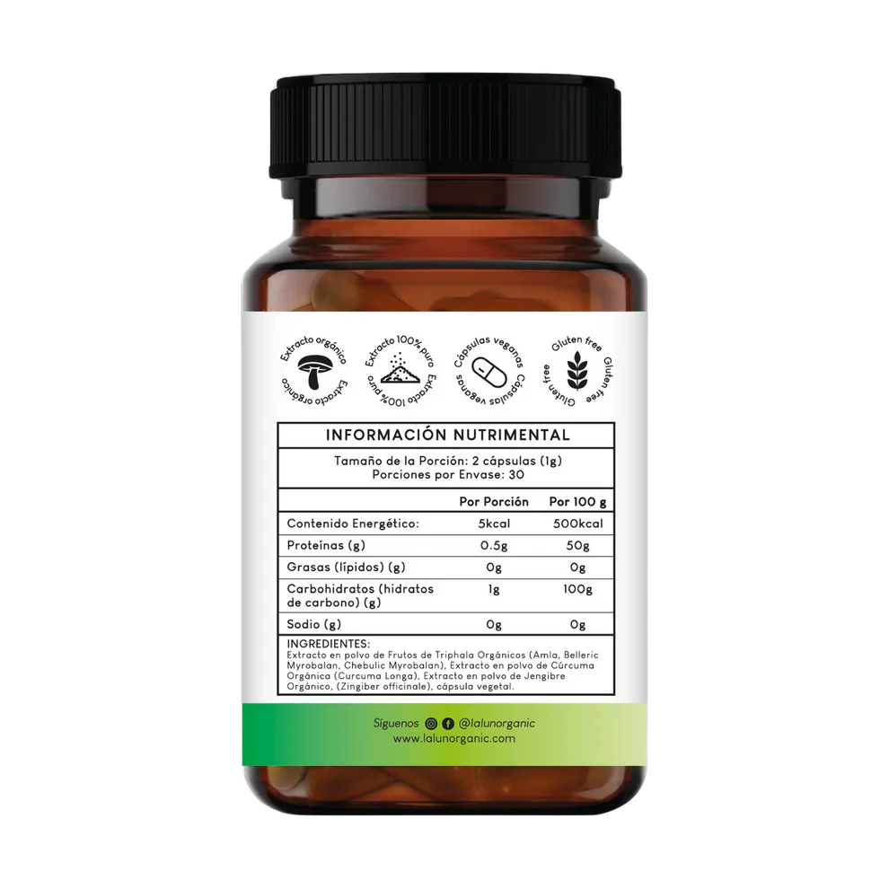 Experimenta el poder de nuestra fórmula sinérgica Digestive Blend, una mezcla cuidadosamente seleccionada de extractos de frutas adaptógenas orgánicas como Harada, Amla y Behada, combinadas con extracto de cúrcuma y extracto de jengibre, reconocidos tradicionalmente por su uso en el acompañamiento del bienestar digestivo.