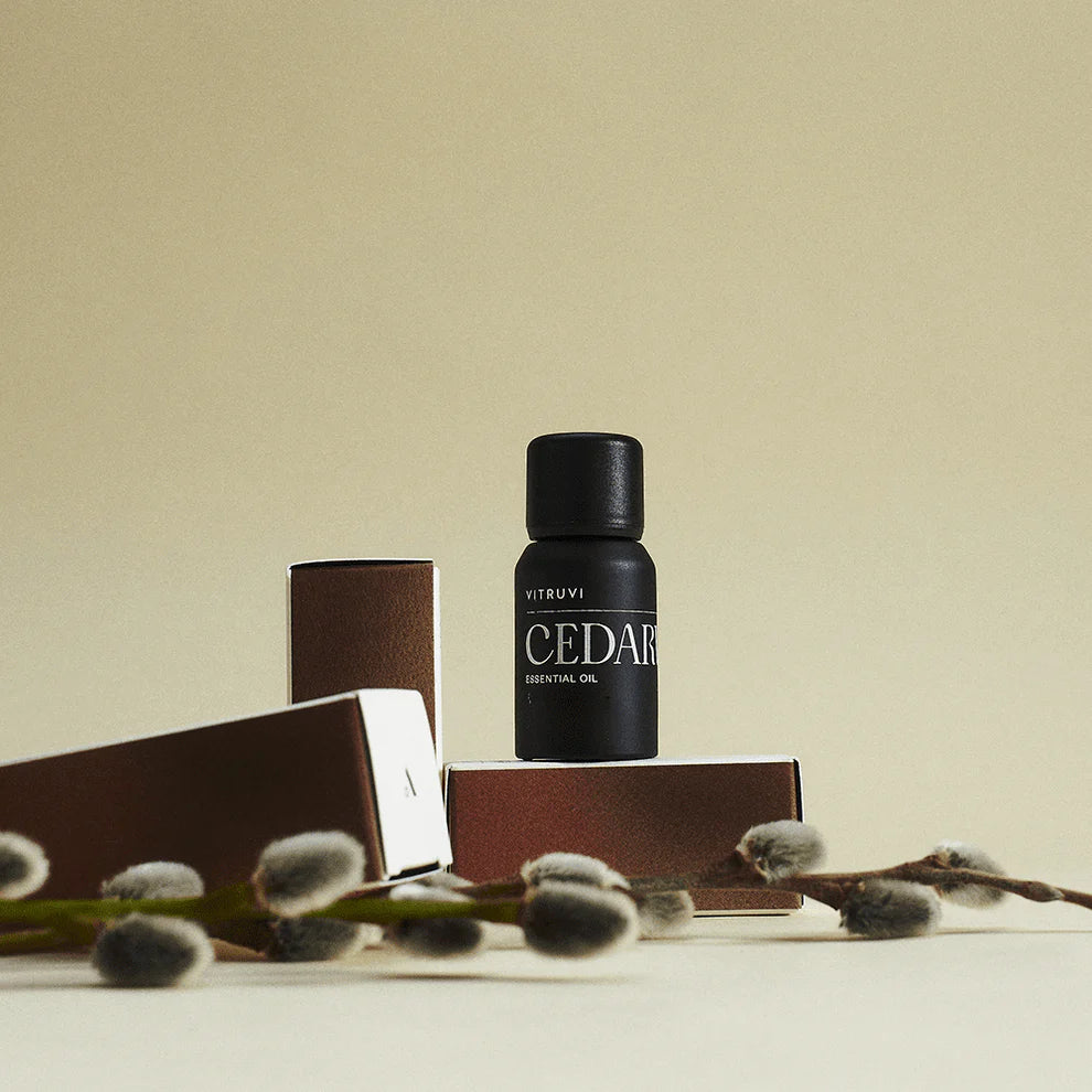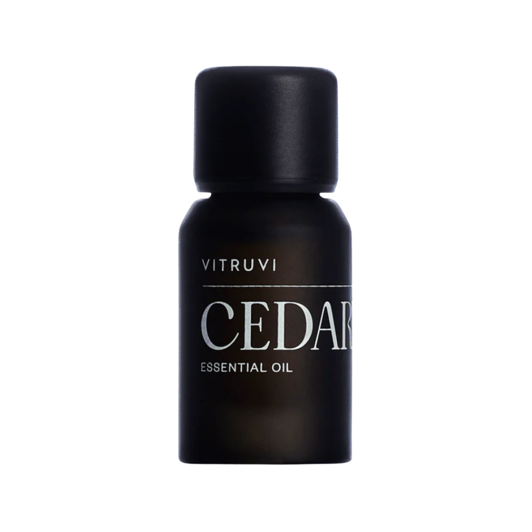 El aceite esencial de Madera de Cedro de Vitruvi se destila de la madera de cedros cultivados en el Himalaya. Su aroma terroso y reconfortante es ideal para crear ambientes relajantes, meditar o preparar el espacio para el descanso nocturno. También se utiliza en rutinas de cuidado personal por sus propiedades beneficiosas para la piel y el cabello